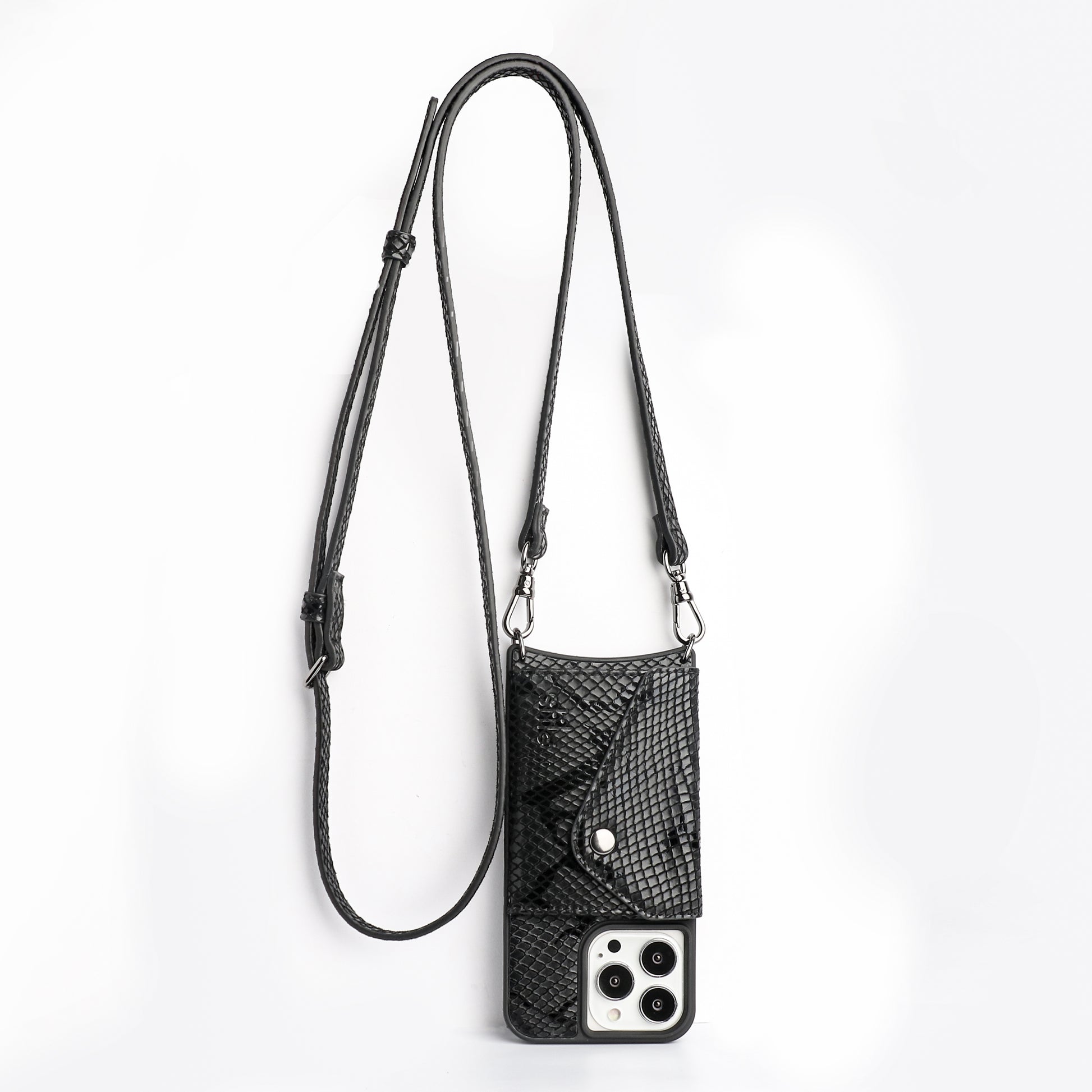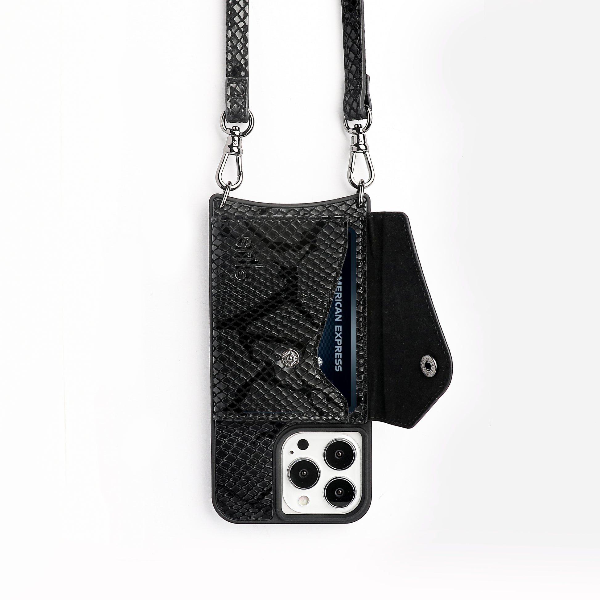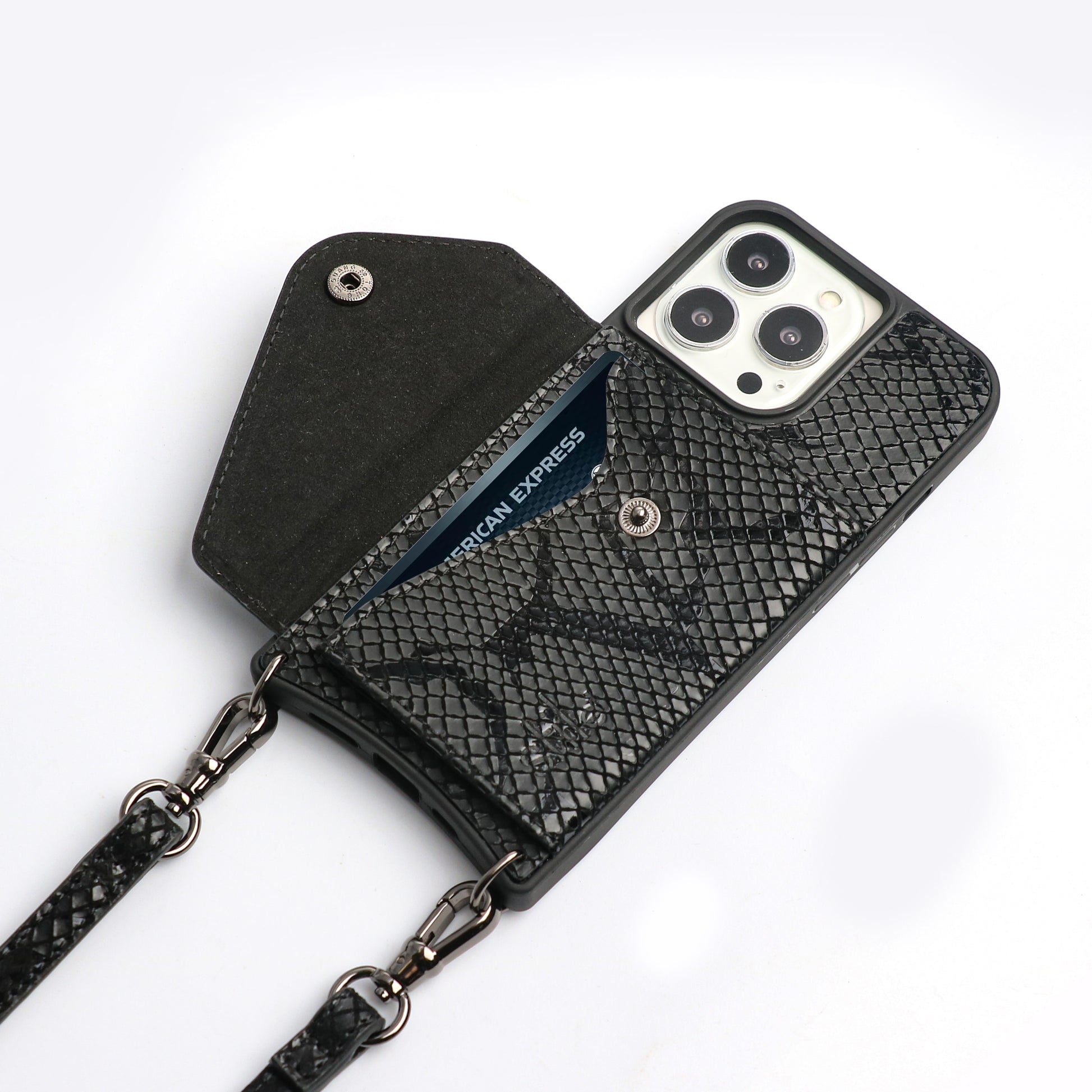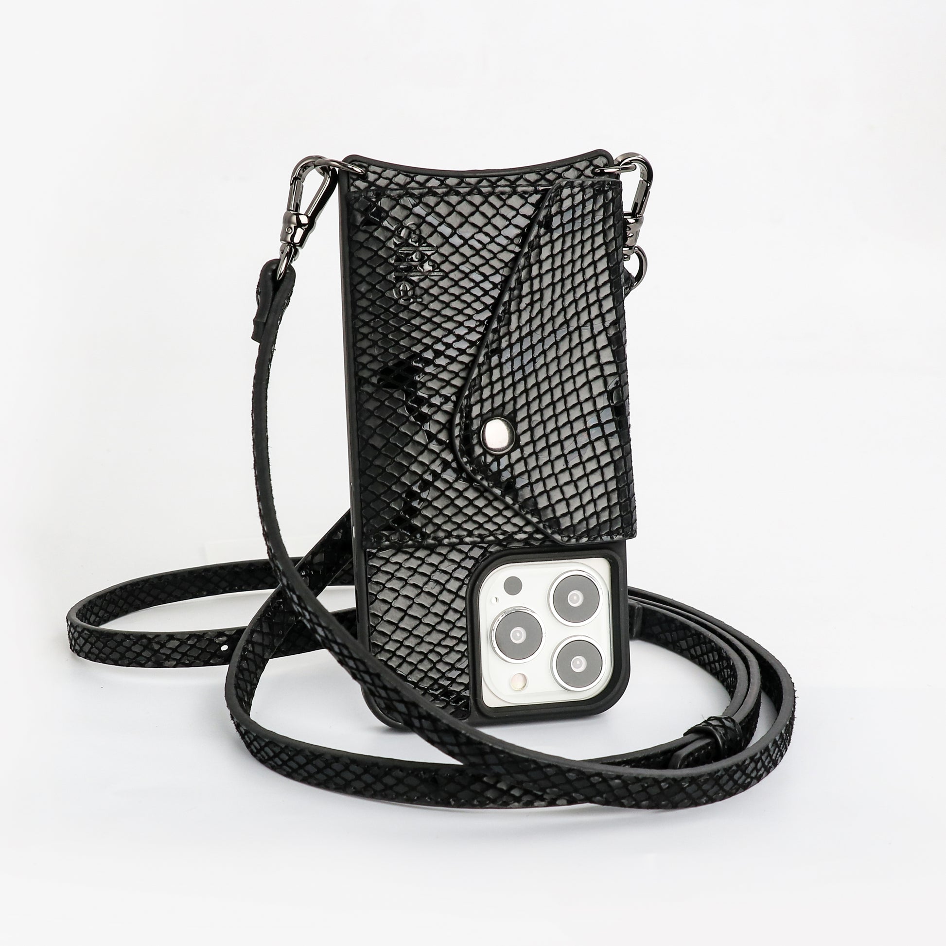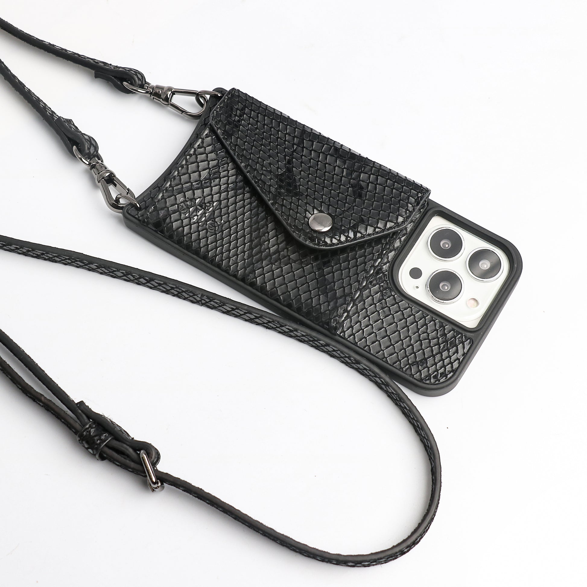 Genuine leather, snake skin texture - phone case with crossbody strap, this must have style comes complete with a back envelope wallet for your cards.
